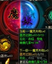 1. 同时将石化、赤焰、紫电器灵等级提升至5/10/15/…/40。可触发“魔灵共鸣”,魔灵共鸣提供特殊属性“人物麻痹几率”加成。无需佩戴妖器即可生效。