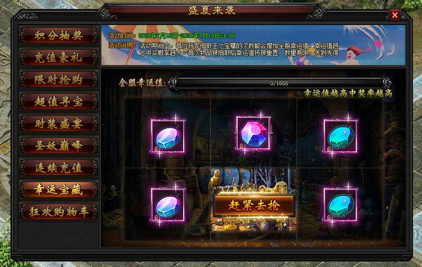 7.1 活动期间内,全服玩家在抽取王之宝藏的时候都会增加全服幸运值