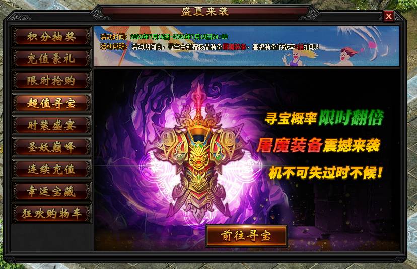 4.2 活动期间内,寻宝中新增屠魔装备,并且高级装备的概率双倍抽取