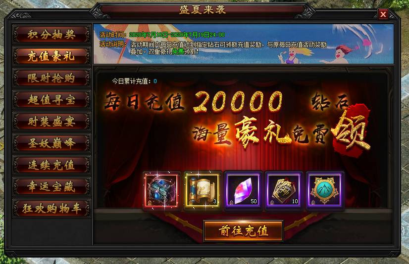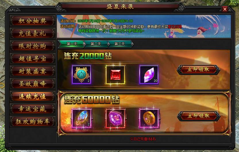2.2 活动期间内,每日充值达指定钻石数额,即可领取充值奖励,可原每日充值奖励叠加领取